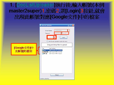 Slide 26: 1. [DocListUploader] 執行後 , 輸入帳號 ( 本例 master2super)1, 密碼 2, 選 [Login]3 按鈕 , 就會出現此帳號對應 [Google 文件 ] 中的檔案 1 2 3 [Google 文件 ] 中 此帳號的檔案